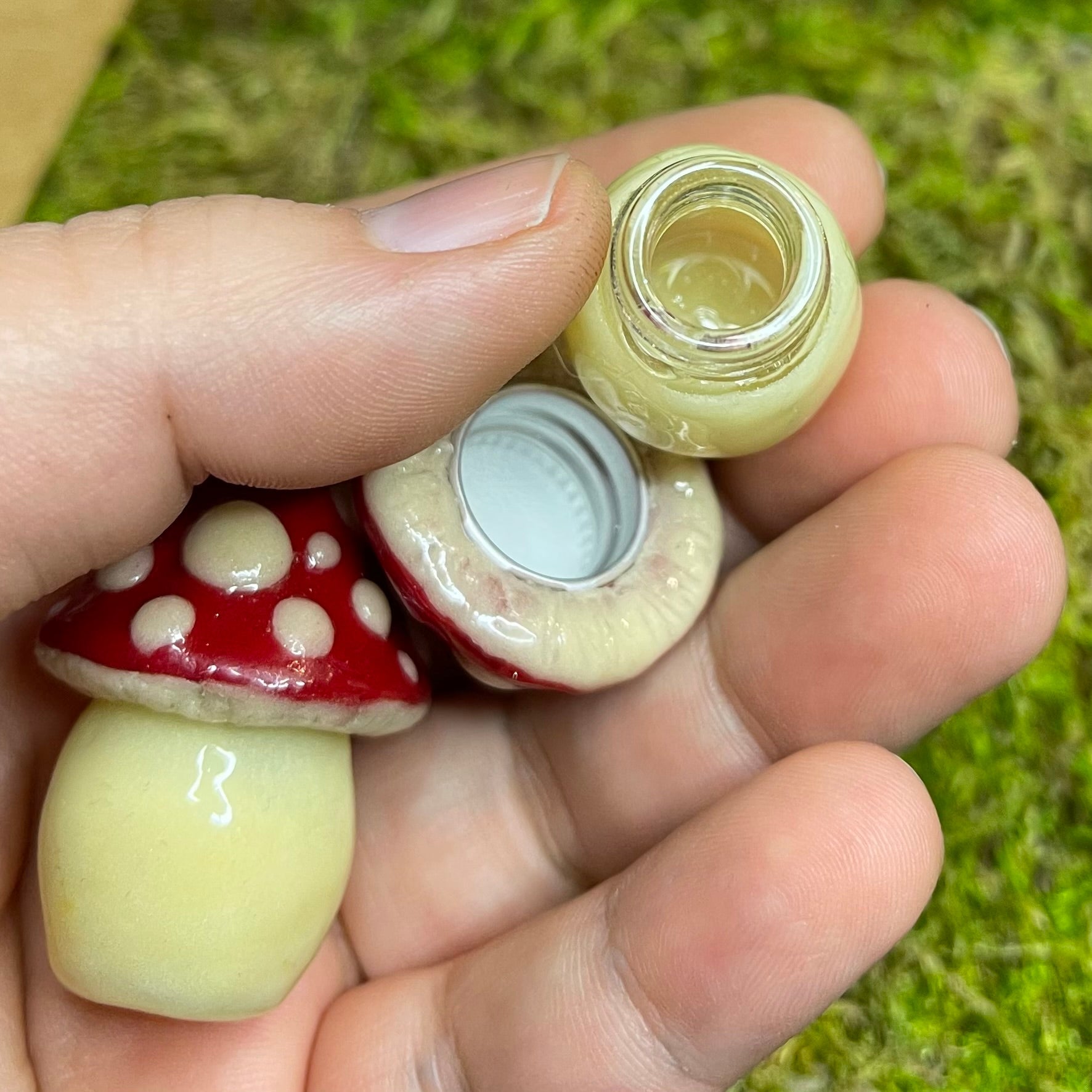 Mushrooms are approx 1 1/2” - 2” tall. Internal jar holds approx 2ml and is 1 1/8” tall and 1/2” wide.