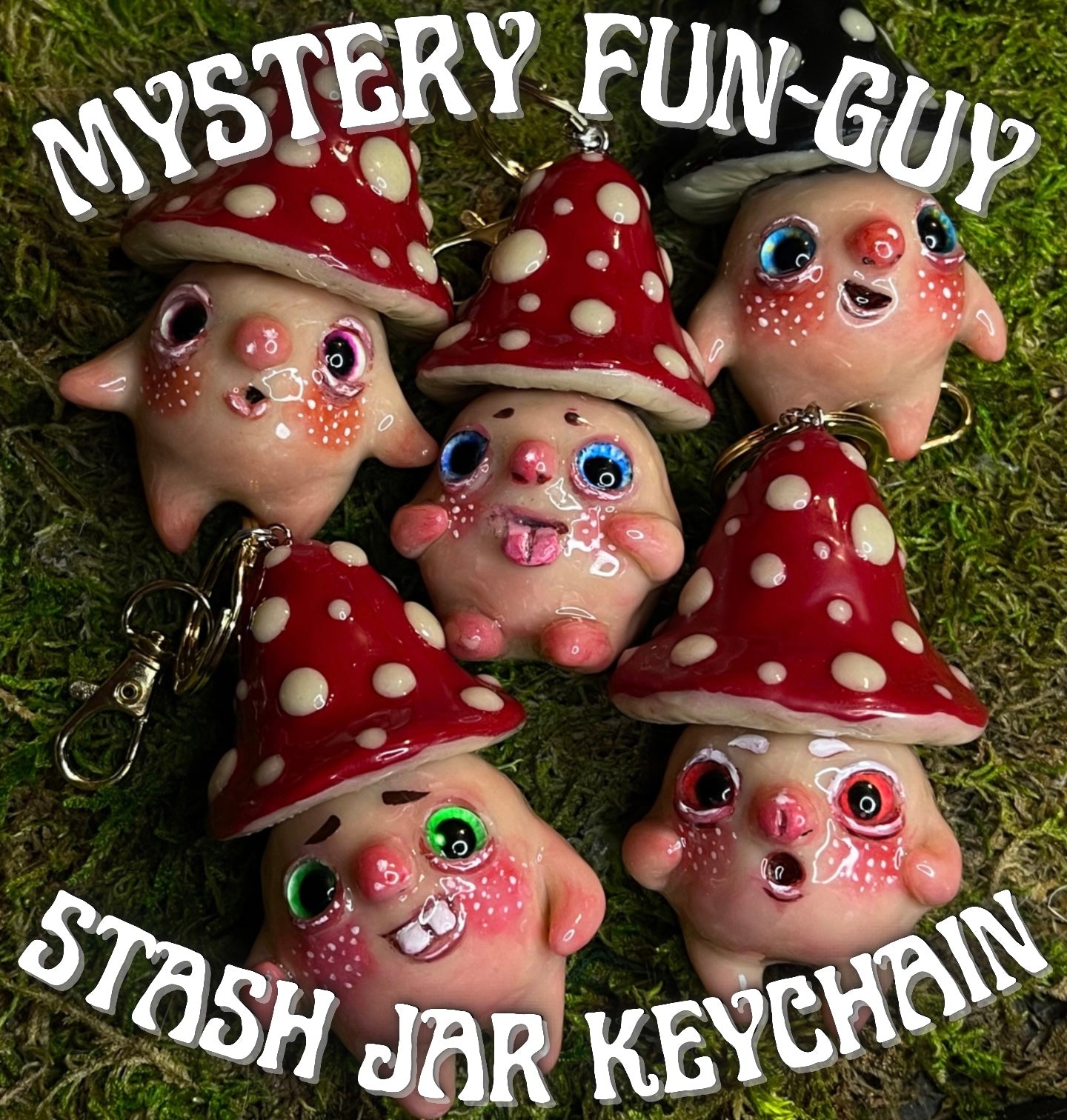 This listing is for a MYSTERY Fun-Guy Stash Jar Keychain. Mushroom color, body style, and face design varies.